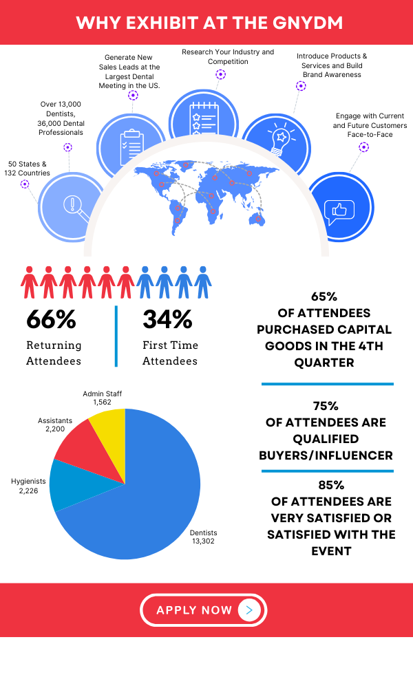 Where Dentistry’s Leading Brands Take Center Stage The 102nd Greater New York Dental Meeting is the premier dental convention in the United States, bringing together decision-makers, innovators, and industry leaders from across the profession. Exhibit Dates: Sunday, November 29 - Tuesday, December 1 As an exhibitor at the 2026 Greater New York Dental Meeting, your booth reservation includes a comprehensive package designed to maximize visibility, convenience, and engagement throughout the Meeting. Standard Booth Setup Includes: 8' background curtain, a 3' side drape partition, Complimentary booth sign listing the company name and booth number. Complimentary Exhibitor badges (up to 8 per 10x10' booth) · Company, product, and/or services listed in the Program and Exhibit Guide (Cutoff date for entry in Program Guide is July 31, 2026) · All exhibiting companies listed in the Onsite Exhibitor Directory · The company posting on the Greater New York Dental Meeting website and APP · Complimentary Shuttle Bus service to/from Jacob K. Javits Convention Center and many hotels We look forward to reconnecting with you during our 2026 Greater New York Dental Meeting! ![]() ![]() FOR INFORMATION CONCERNING: ExhibitsE-mail: Ms. Carla M. Borg Phone: 212-398-6922 x 102 Fax: 212-398-6934 Sponsorship and Advertising E-mail: Ms. Dana A. Soltis Phone: 212-398-6922 x 107 Fax: 212-398-6934 Greater New York Dental Meeting, LLC 200 W. 41st, Suite 1101 New York, NY 10036 (T) 212-398-6922 / (F) 212-398-6934 |
